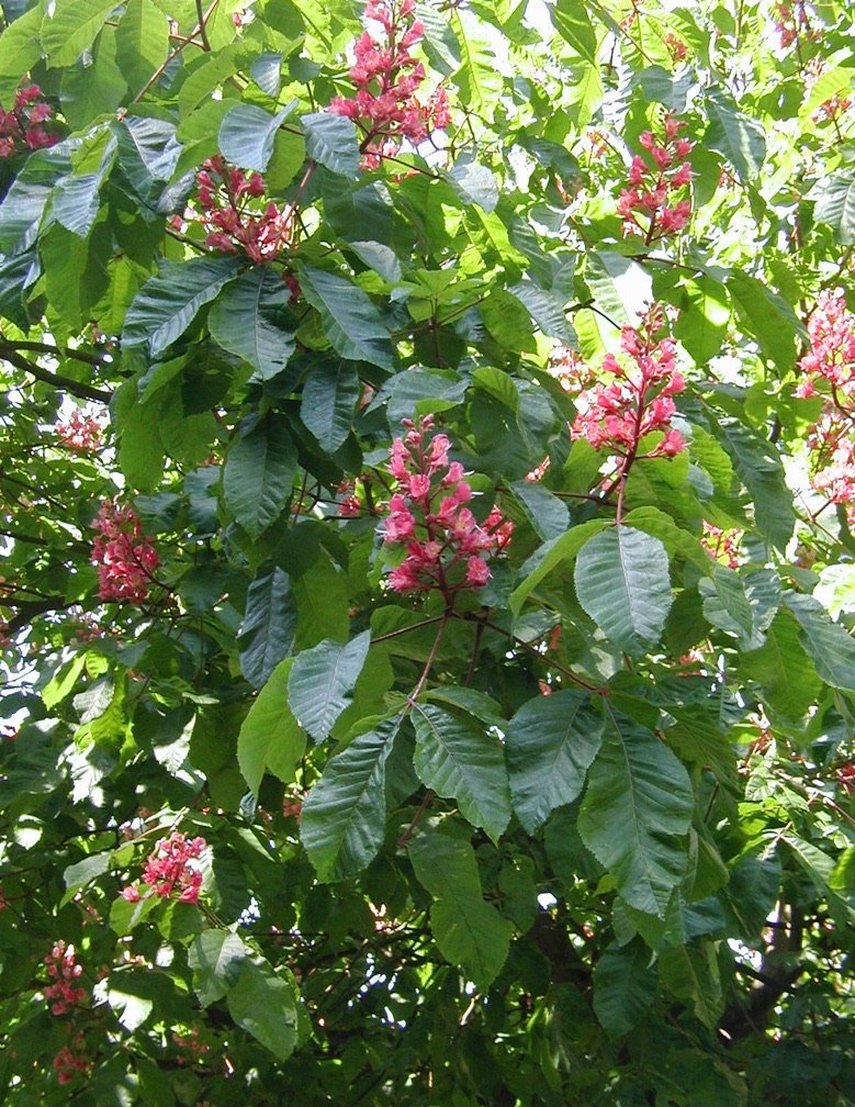 A very showy hybrid of the North American Red Buckeye (A. pavia) and the European Horsechestnut (A. hippocastanum). The reddish-pink (‘Fort McNair) or reddish (‘Briotti’) flowers have a yellow throat and like those of Red Buckeye are particularly attractive to Ruby-throated Hummingbirds. While the foliage of this variety is resistant to foliar problems (leaf scorch and dropping of foliage), it is not immune – they plague all members of the group. Make sure you provide a site with a little afternoon shade and moist soil – even established trees appreciate being watered during extreme droughts.