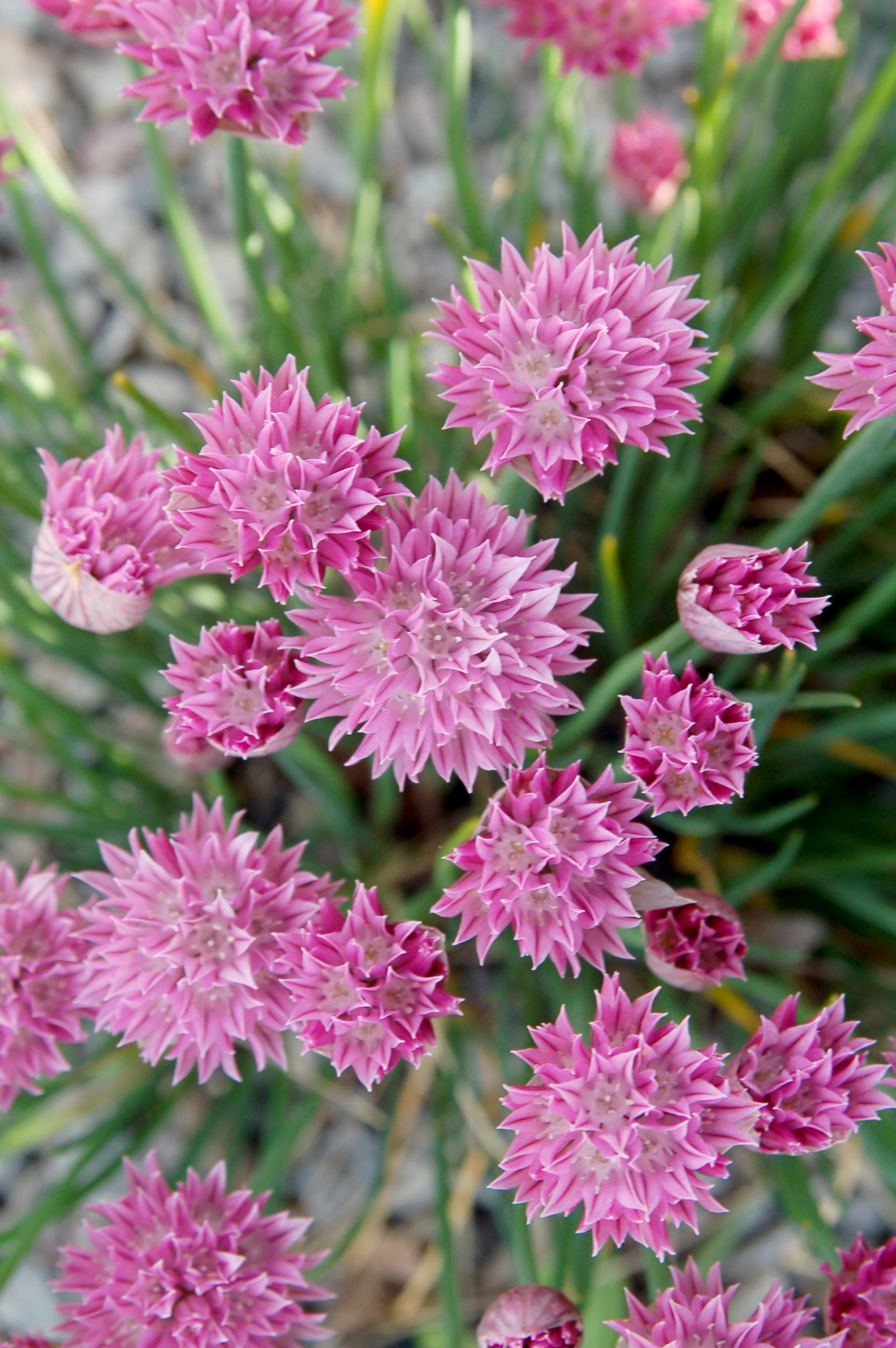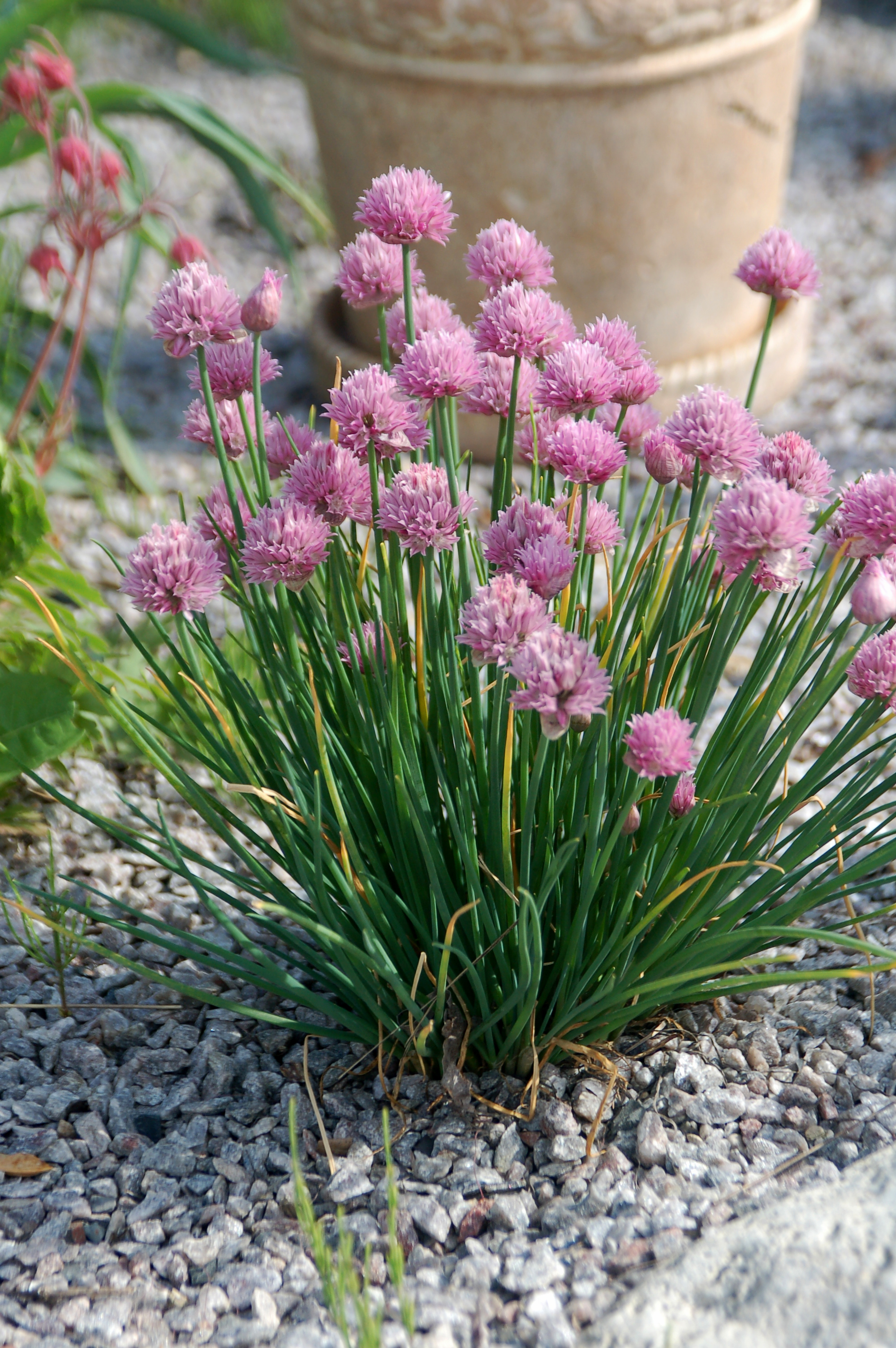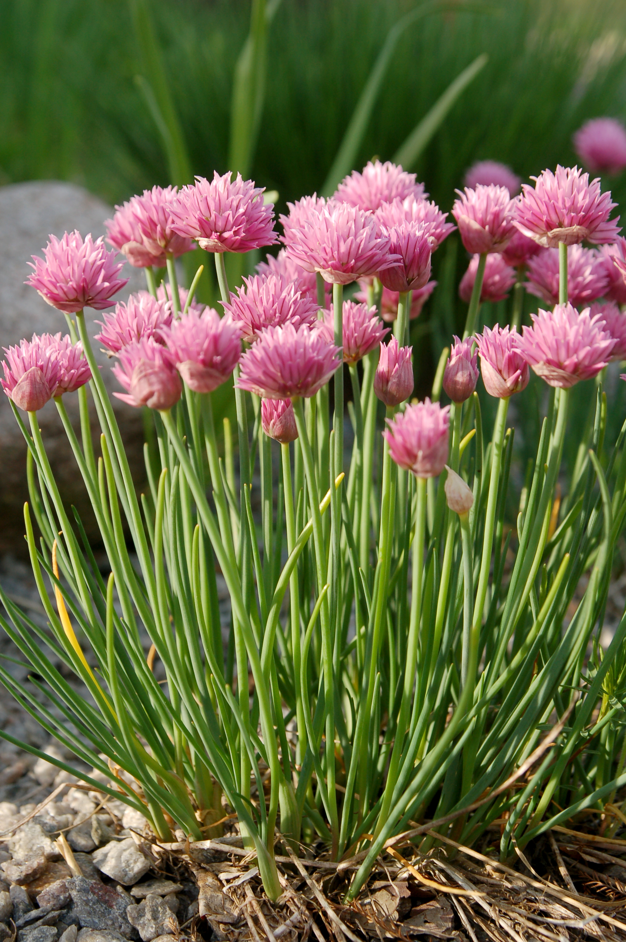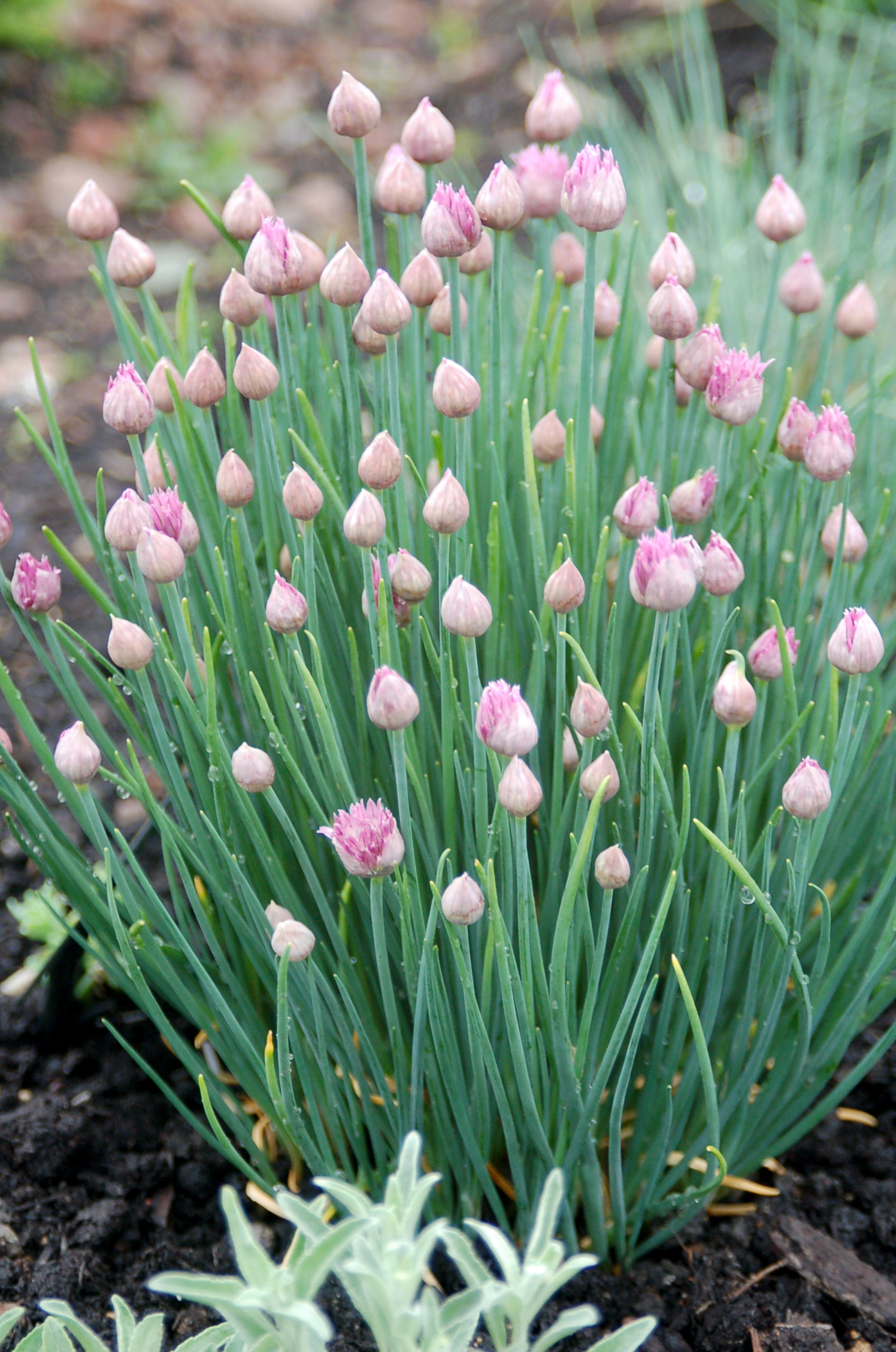 Extra dwarf pink chives, reaching only 10 to 12 inches tall and wide, bloom in May. Fine gray-green grassy foliage looks nice all season long. Easy to grow. Plants prefer full sun and average to well-drained soil.