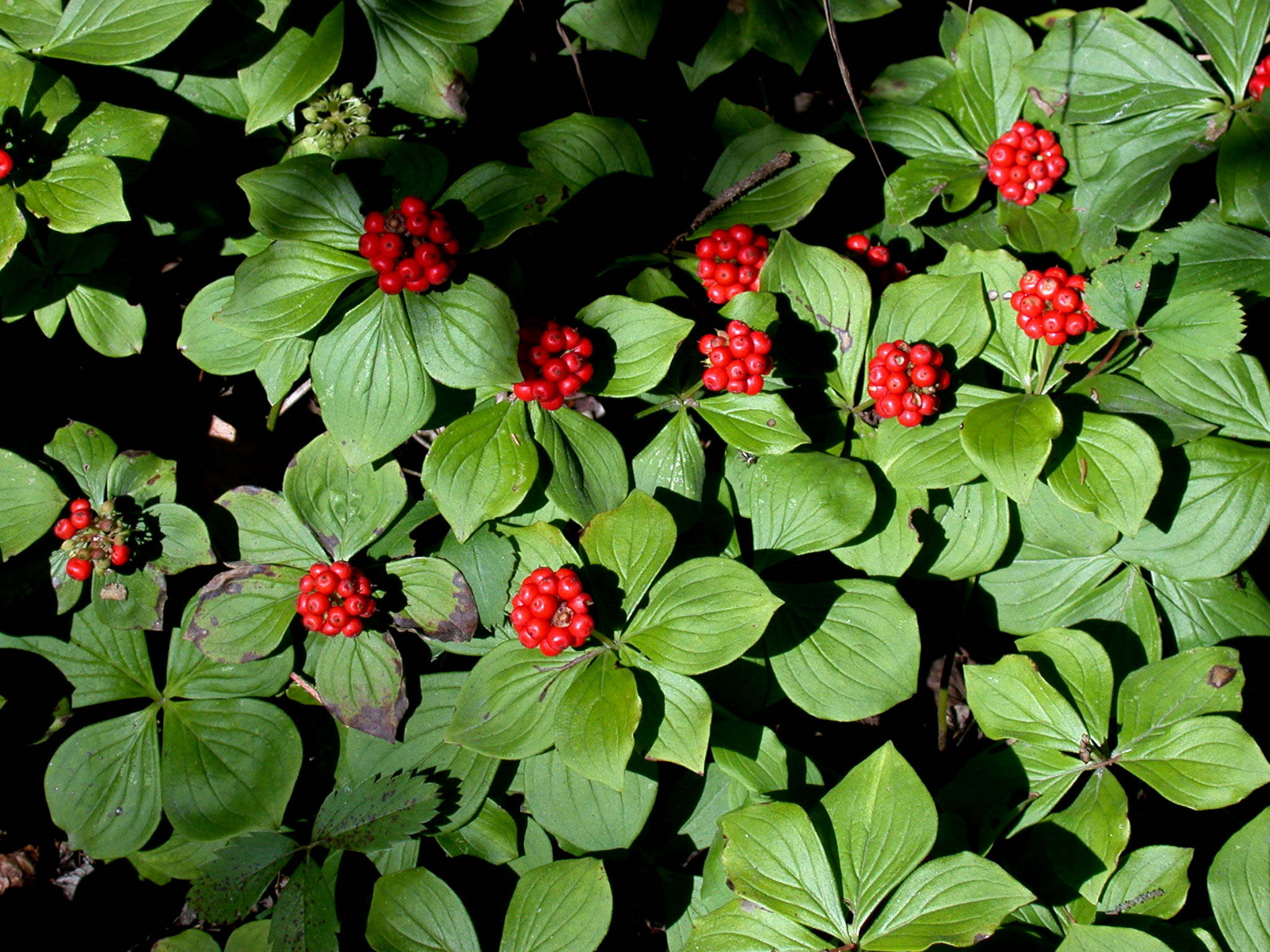 A beautiful woodland groundcover – everyone wants to grow this cute Flowering Dogwood relative, shrunk down from a mid-sized tree to a low, slowly-spreading groundcover. Unfortunately, it’s not so easy to grow, demanding a cool, moist microhabitat. In the Catskills we only see the species at higher elevations where summer heat is rare. So find a spot with at least a little afternoon shade, and soil with a great deal of moisture-retaining humus. Then keep your fingers crossed. You could also try a swampy area – the species is often found at the edge of or on hummocks in swamps and bogs. The fruiting clusters from which the plant’s common name is derived (shown in the inset) are also very ornamental. For those of you gardening at higher elevations, in the Catskills or elsewhere, Bunchberry can be grown in sunnier garden spots as long as the soil stays moist.
