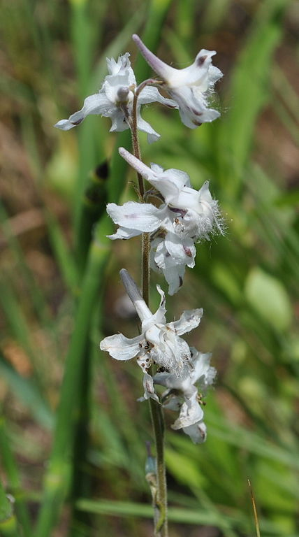Sometimes accorded species status as Delphinium virescens, most botanists consider this a subspecies of the widespread Carolina Larkspur (D. carolinianum). Belying it’s common name the species occurs from Wisconsin to North Dakota south to New Mexico and Florida. This subspecies covers much of the range of the species but is absent from the Southeast and is particularly abundant in the Great Plains. It’s completely absent from the Northeast but it grows well here in meadows and sunny flower borders. Like most member of the genus it can be a bit short-lived but will self-sow where happy. While the species generally has bluish purple flowers, Prairie Larkspur usually has white flowers with purple-tinged spurs – a favorite of bumblebees and hummingbirds.
