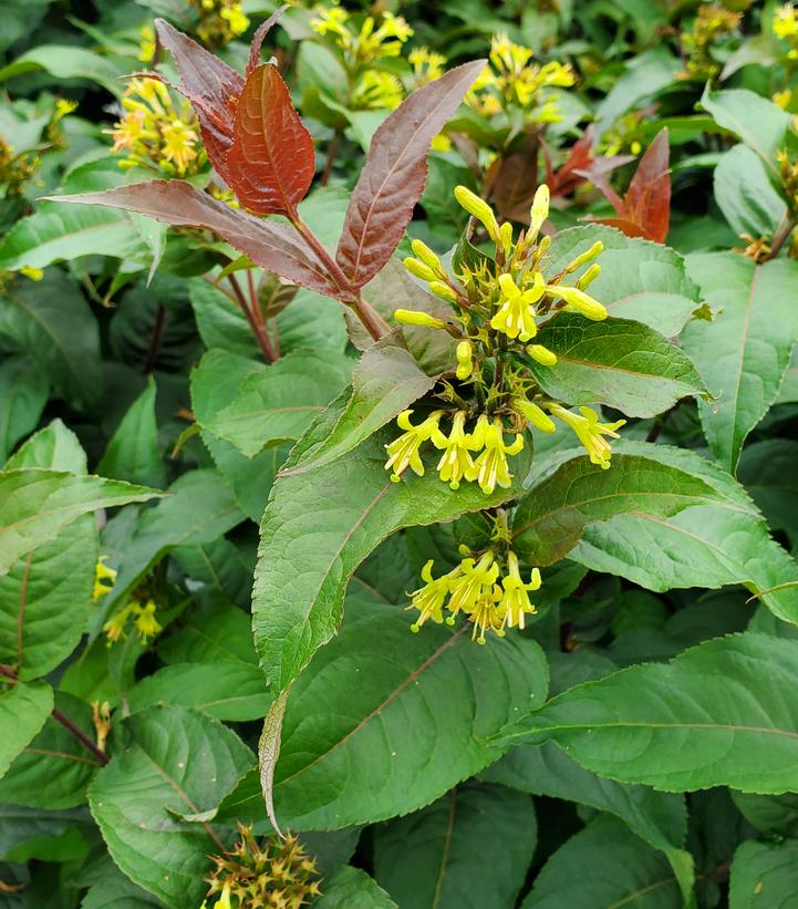 We really like the look of this new variety with an overall bronzy caste to the foliage, and particularly pronounced crimson to ruby color of new foliage. It’s native to the southern Appalachians, but our bumblebees seem to like it as much as the local native, Diervilla lonicera.