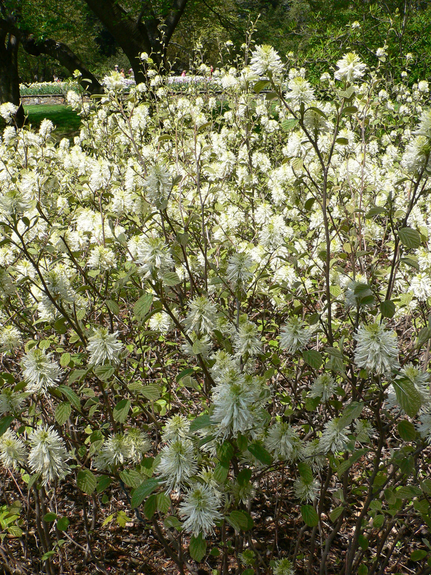 A magnificent small shrub that offers superb flowers and foliage. White, honey-scented flowers occur in 1- to 2-inch long bottle-brush like inflorescences. Over a long period of time in fall the foliage takes on a cacophony of color: shades of apricot, orange, maroon, and crimson appear, often together in the same leaf. Prefers a moist, well-drained, acidic soil. An excellent choice for foundation plantings.