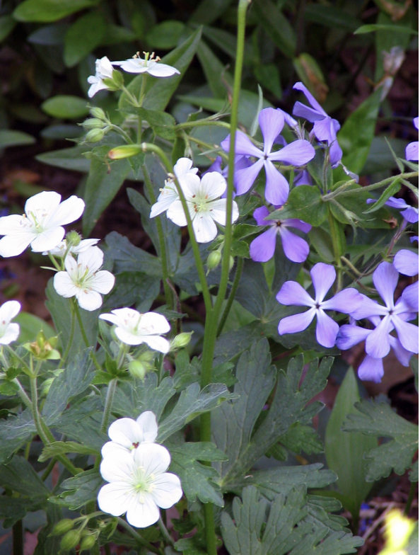 A white form of this common wildflower that is particularly useful for brightening partly shady locations, especially when combined with many other woodland wildflowers, such as the woodland phlox (Phlox divaricata) shown here, that bloom in the violet to lavender blue range and clash with the normal mauvey-pink of wild geranium. This is a good butterfly nectar plant that will find places in your garden where it’s happiest through self-sowing.