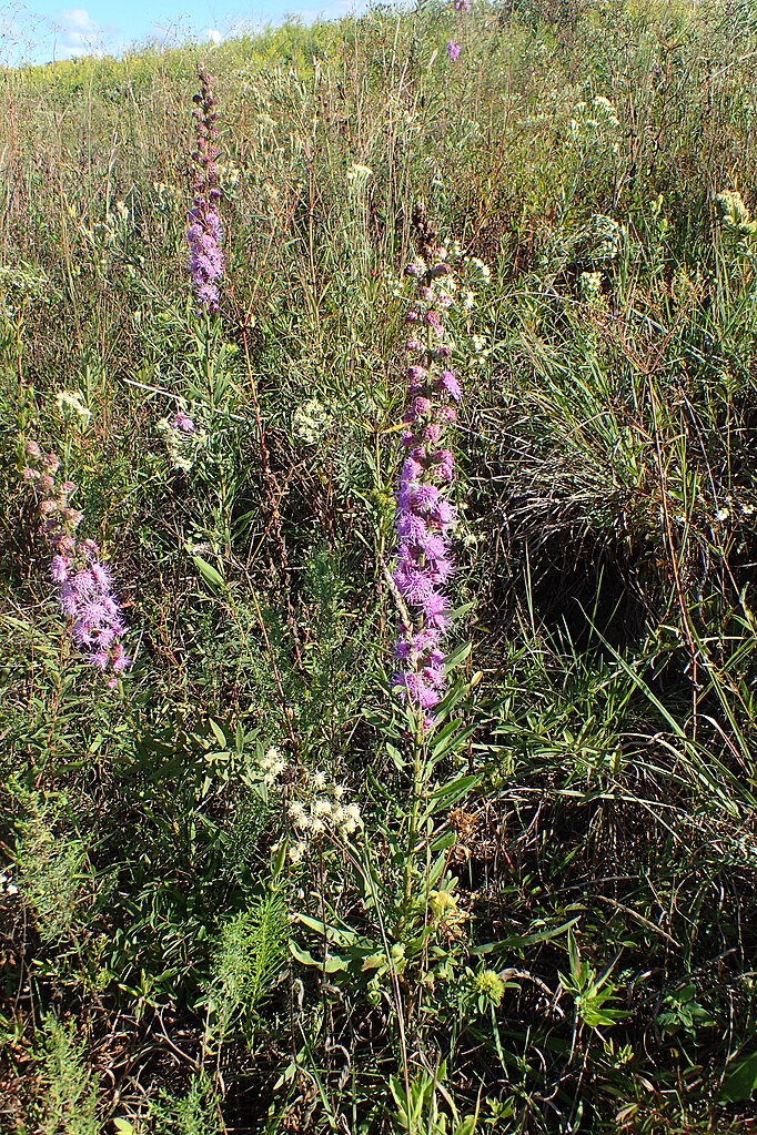 The most showy Blazing Star for drier conditions. The button-type flower heads are spaced out along the stems and are short-stalked or stalkless. Many butterflies find the flowers irresistible – you’ll be sure to attract them to your garden if you plant this species. For best results grow in full sun and well-drained soil – the plant will become floppy if grown in too rich of a soil or in too much shade. Found mostly from Michigan to North Dakota south to Texas and South Carolina – occurrences in New York near Lake Ontario and the Bronx appear to be introductions.