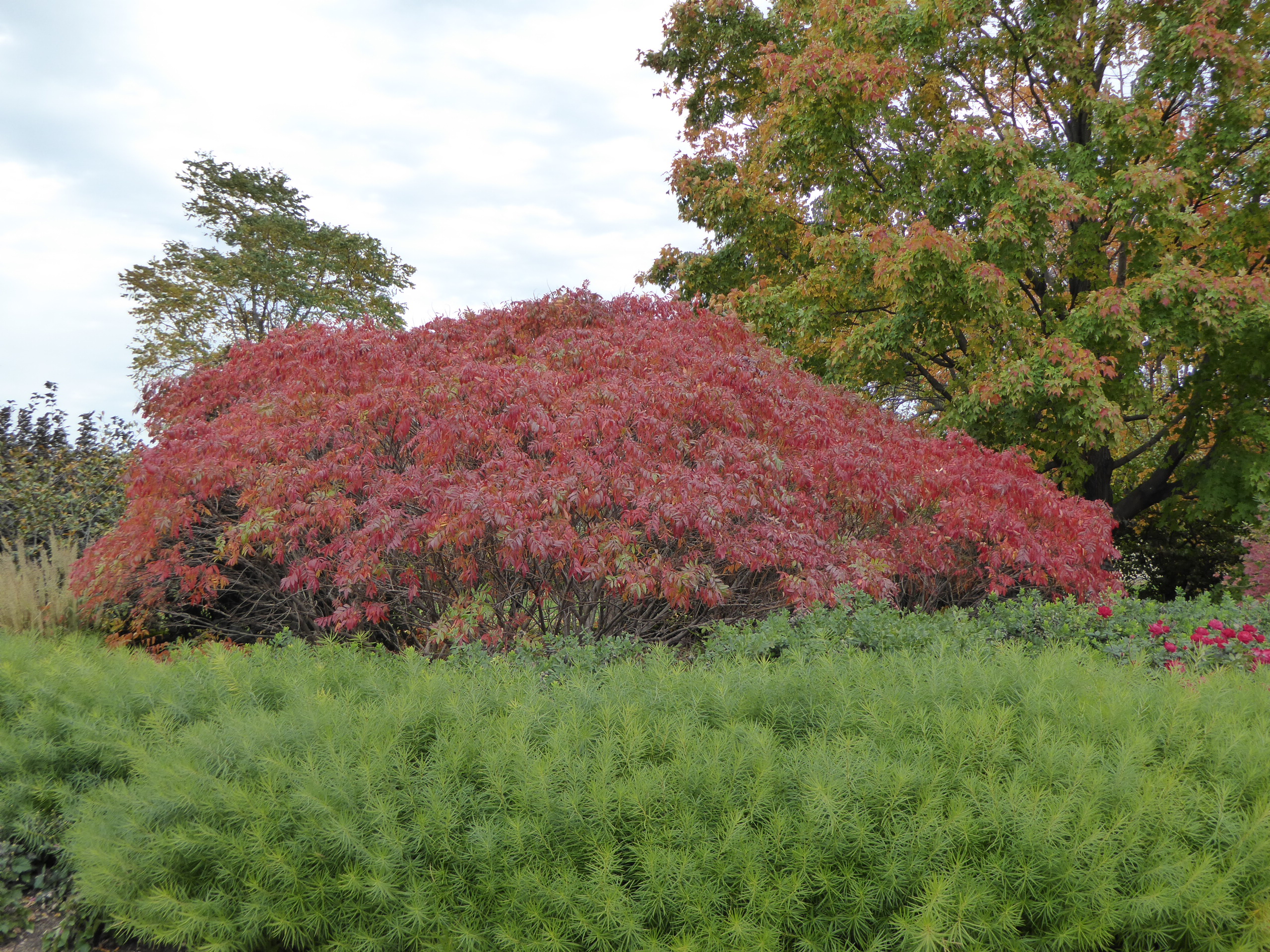 This Morton Arboretum (Lisle, Illinois) introduction is noted for its compact size, glossy green summer foliage and spectacular red fall color. It’s a male cultivar (the species is dioecious) that does not produce fruiting clusters. The male flowers are still a valuable nectar and pollen source for beneficial insects. Plants are densely branched when young, but open up somewhat with age. Like all sumacs, it spreads by root suckers and forms a colony over time.