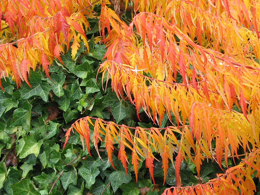An elegant form of Staghorn Sumac with fern-like leaves, bold architectural form and all of the positive features of Staghorn Sumac along with some of its bad ones. The positive features include a tough-as-nails disposition, drought tolerance, pest resistance, spectacular fall color, and fuzzy, cranberry-like fruits that are a favorite of birds in winter. The real challenge of this plant is its size and growth habit. It spreads laterally by vigorous suckering, forming dense multi-stemmed thickets. It’s an impressive plant to build a garden around, or as a specimen in an open area, but can be difficult to incorporate into an existing garden.