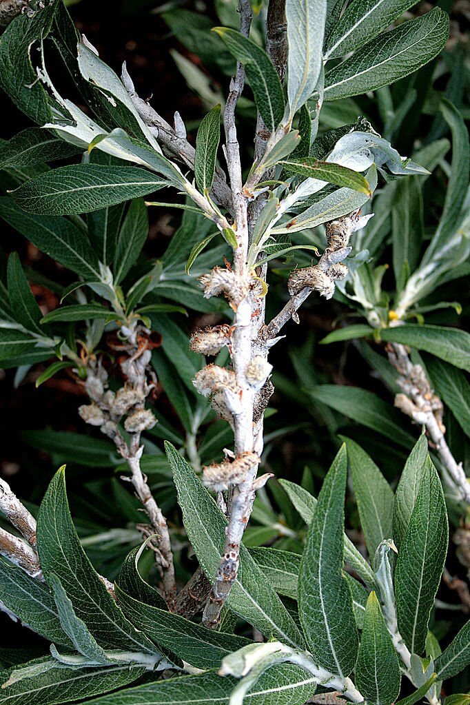 Everyone knows Pussy Willow (S. discolor). There a number of other native willows, typically difficult to find in the trade other than at native plant nurseries, that are equally endearing and deserving of more use in home landscapes, for not only their ornamental value but for their value for wildlife as well. Sageleaf willow is one of these willows. And it’s attractive enough that is has made it into mainstream horticulture in the form of ‘Iceberg Alley’ – discovered in Canada, it has particularly pronounced silvery-green foliage and extreme cold-hardiness. Willows are dioecious (male and female flowers on separate plants). ‘Iceberg Alley’ is a male plant providing pollen for early Spring pollinators. Our straight species plants are female and provide nectar for pollinators. Plant both and you’ll get seeds that songbirds dine on. Willow foliage feeds many of our butterflies. The shrubs’ dense form provides nesting spots for songbirds.