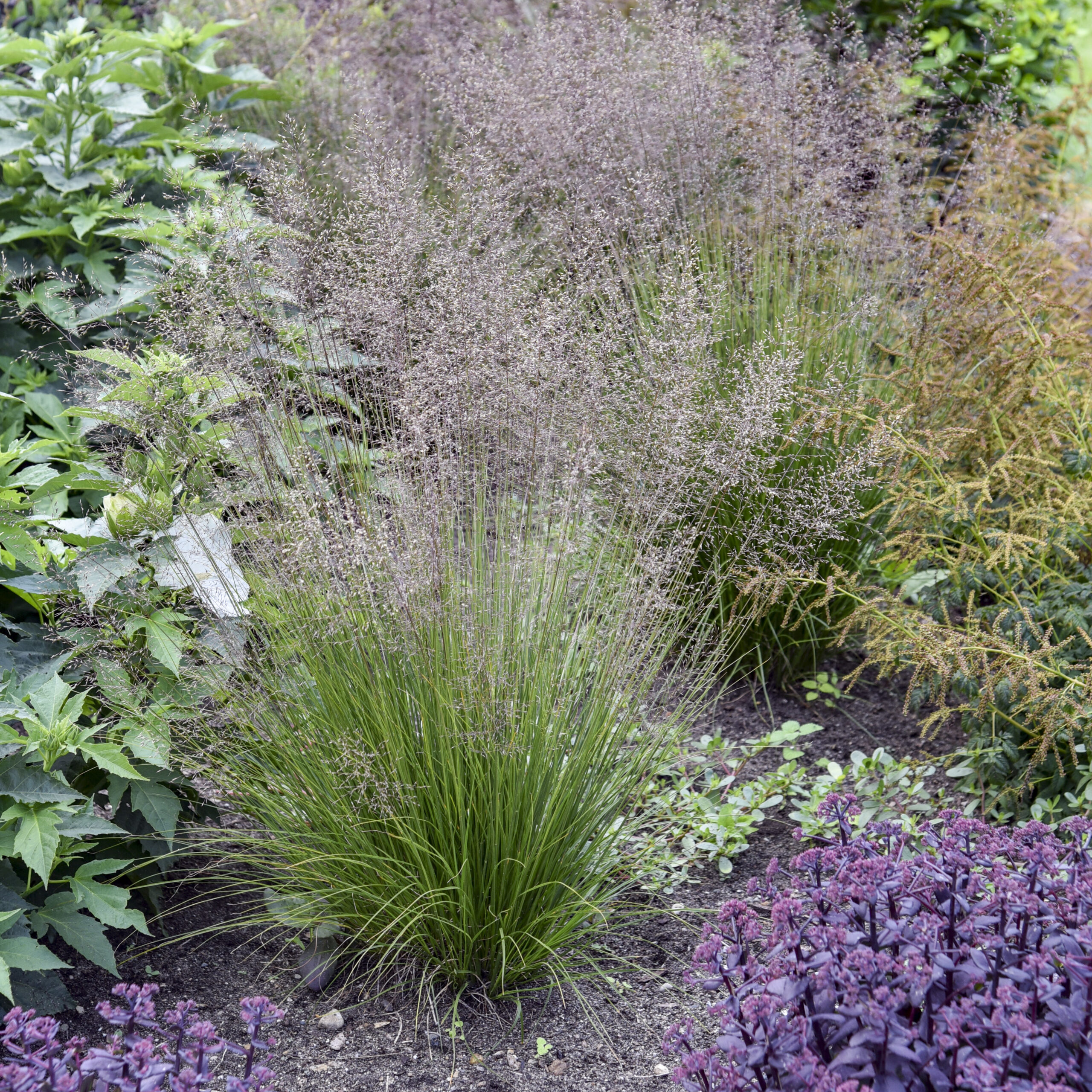This is a new seed strain of the native grass known for its hair-like foliage and mass planting appeal. ‘Gone with the Wind’ is shorter than the species, but still maintains many of the characteristics that made this type of grass popular. Its short, green foliage is topped by wispy, airy and aromatic tan flower panicles. The plant, as the name suggests, gently sways with the wind, creating unique movement in the garden. Foliage takes on red overtones in late fall.