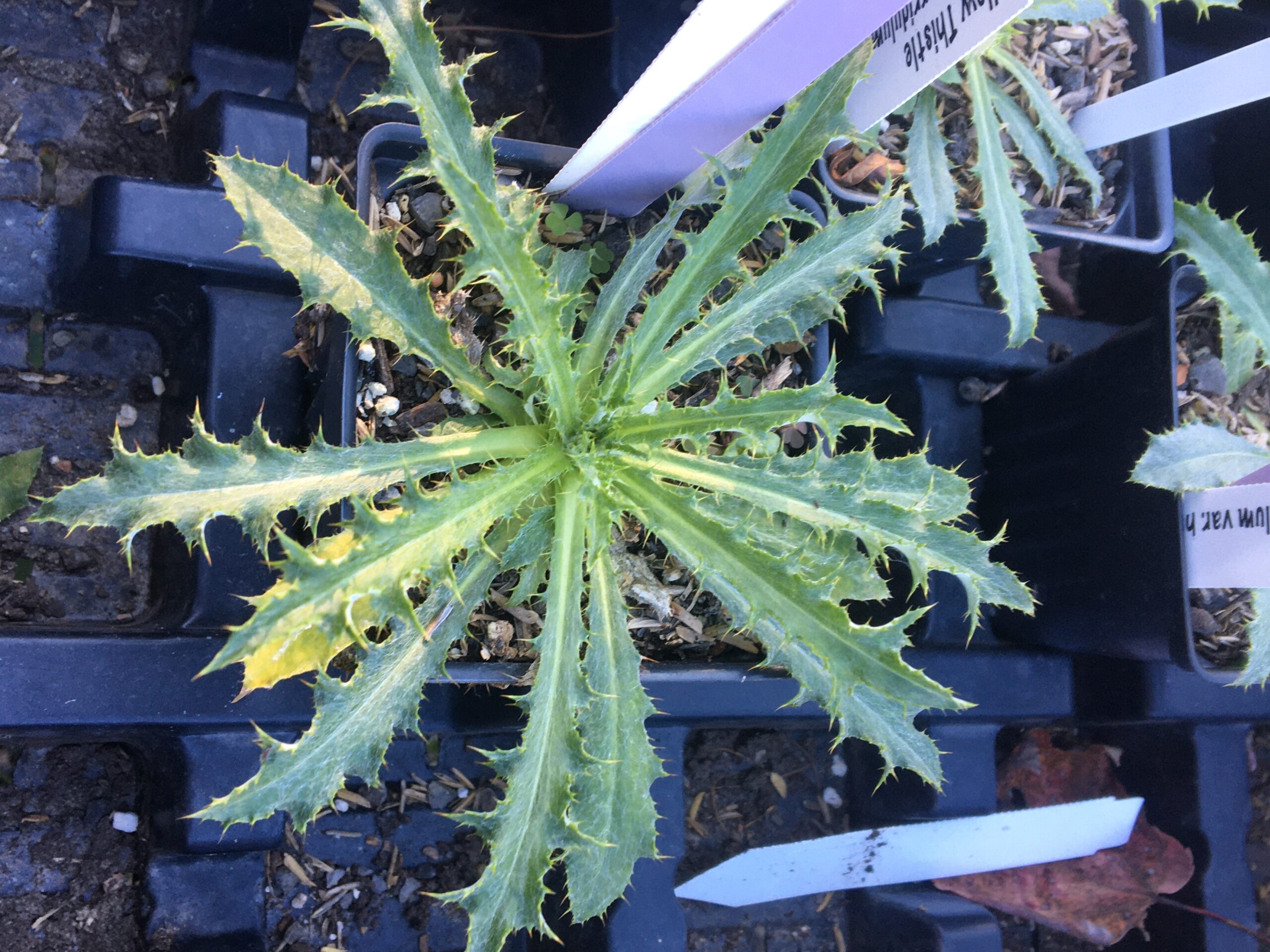 Thistles are a distinctive wildflower in old fields and sunny roadsides, but most are introduced from Europe – occasionally you’ll come across a native one such as Yellow Thistle. The species is distinctive not only for its yellow flowers (most thistles are pink to purple in color), but for the way leaves just below the flower head fold upward and inward to envelop the involucre (the basal cup of the flower head). In New York, Yellow Thistle mostly occurs on Long Island. Our plants are grown from seed from plants nursery employee Mike Bazzani spotted growing near the nursery – a first record of the species in Ulster County! Biennial or short-lived perennial – allow the plant to go to seed for it to be maintained in your garden.